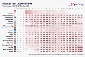 此役过后,数据机构OPTA超级计算机预测本赛季英超冠军↓