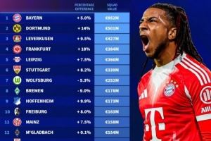 德甲各队身价排名:拜仁9.52亿欧遥遥领先 多特蒙德5.01亿欧第二