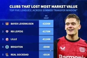 体育资讯9月5日讯 2025年五大联赛的夏窗已经落下帷幕,德国转会市场统计了在夏窗过后,全队身价跌幅最多的球队排行榜。