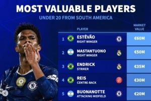 体育资讯10月30日讯 《转会市场》统计了南美籍U20球员身价情况,切尔西新星埃斯特旺领跑。